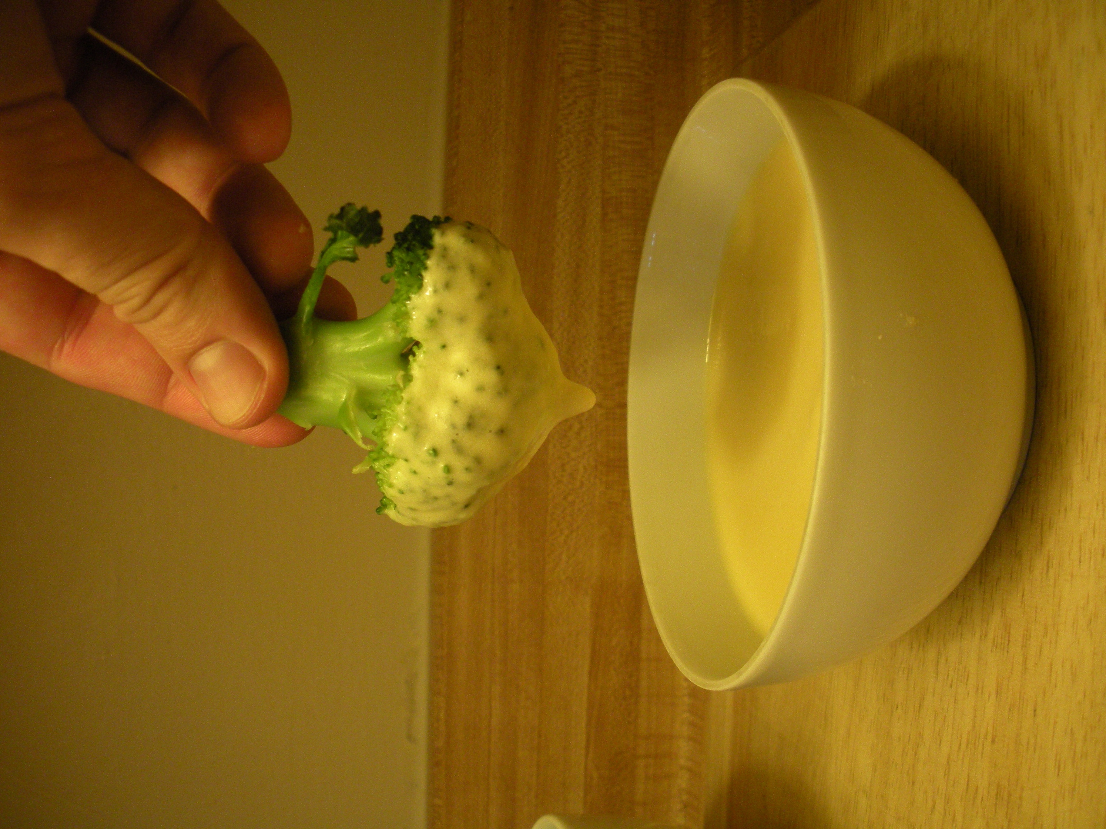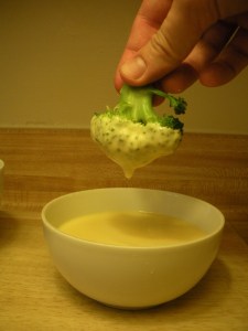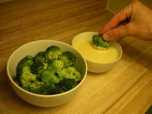 This weeks recipe is steamed broccoli florets with a queso sauce to dip them in. Children typically like finger foods and simple, mild flavors. When vegetables, like broccoli, are cut into dipable bites, eating them can be fun for kids instead of a chore.