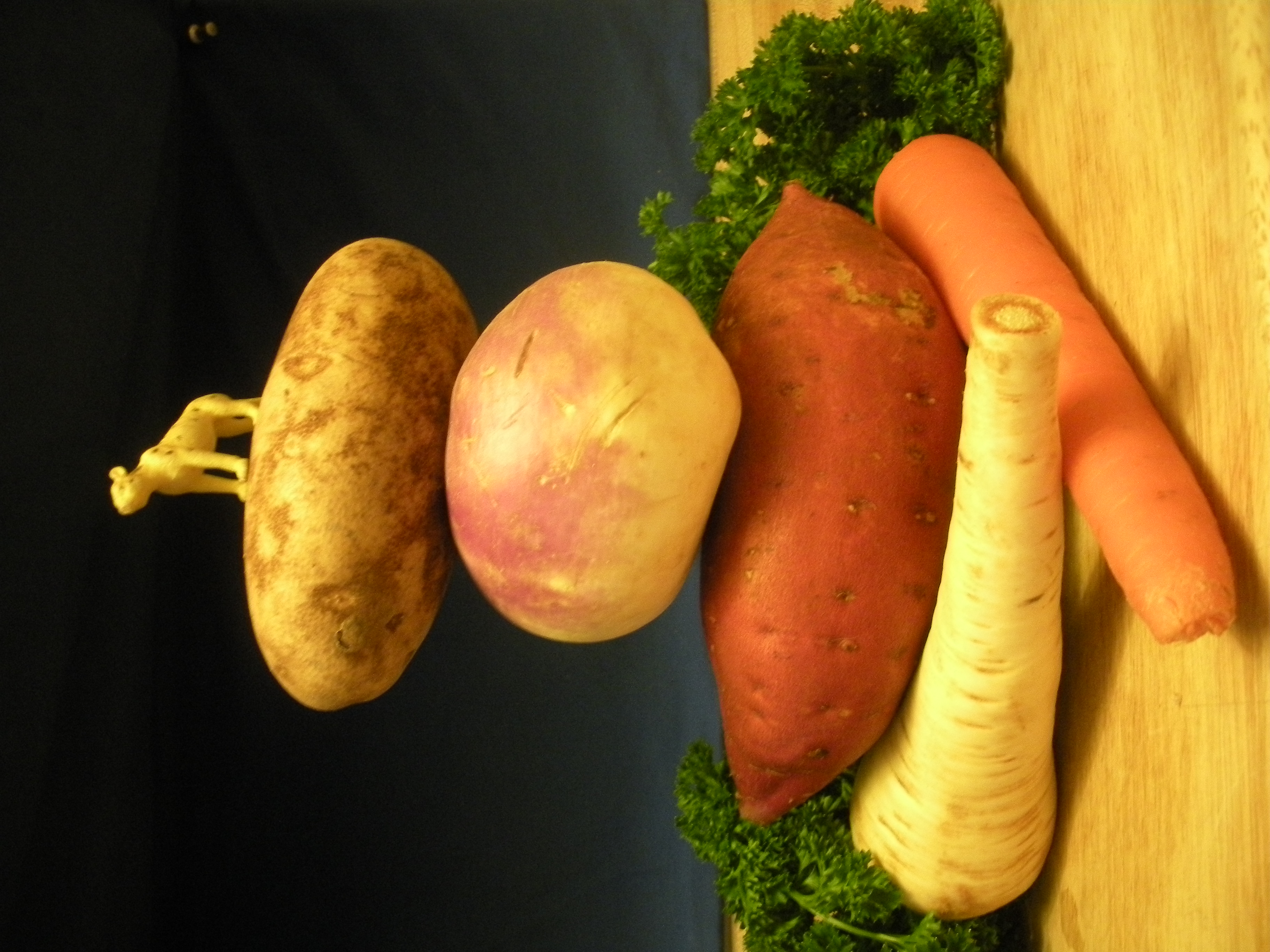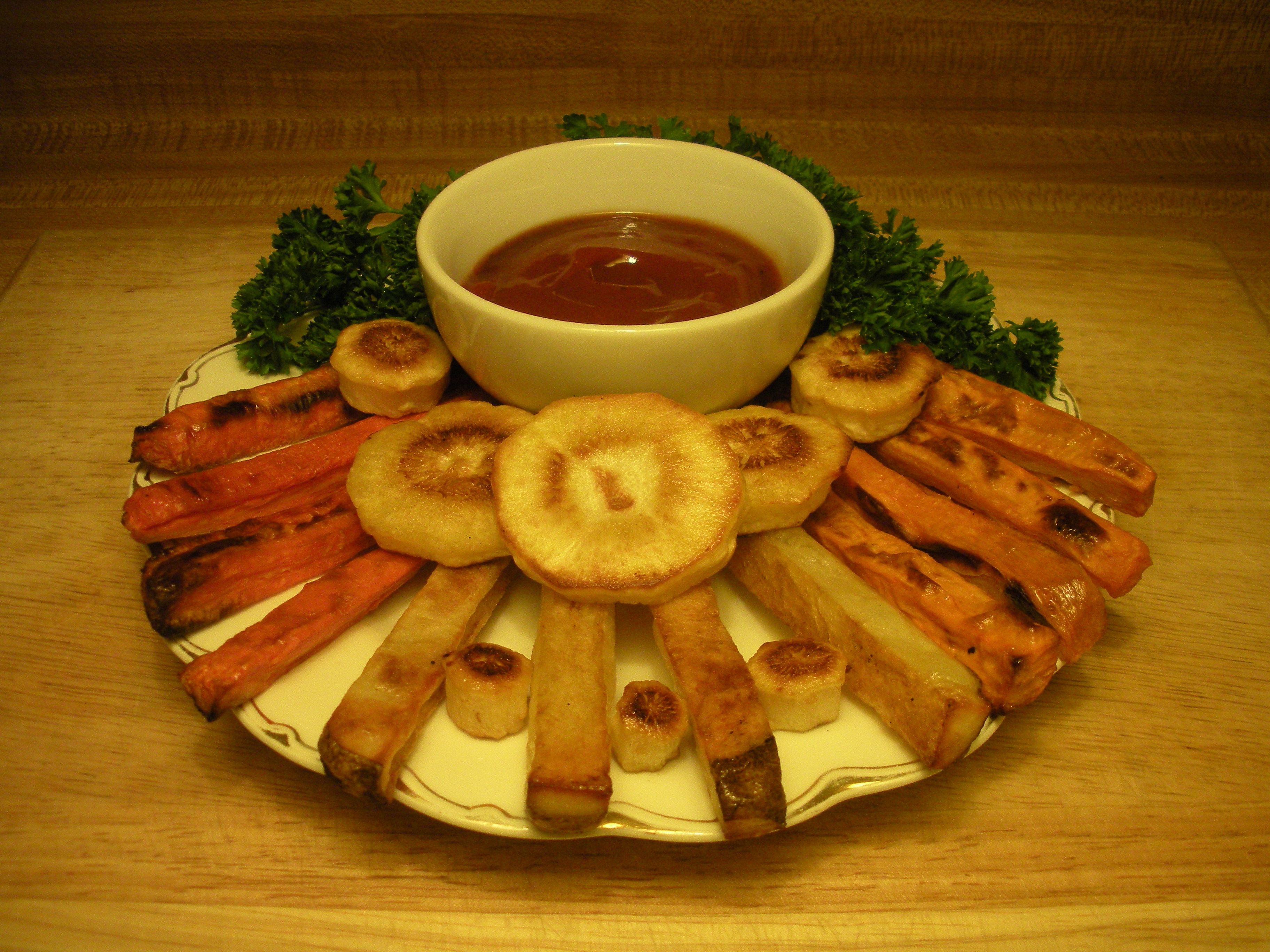 Roasted root vegetables are a healthful and delicious alternative to french fries. Examples include potatoes, sweet potatoes, carrots, parsnips, turnips, and beets. Kohlrabi is not technically a root, but is turnip-like and also roasts well.
