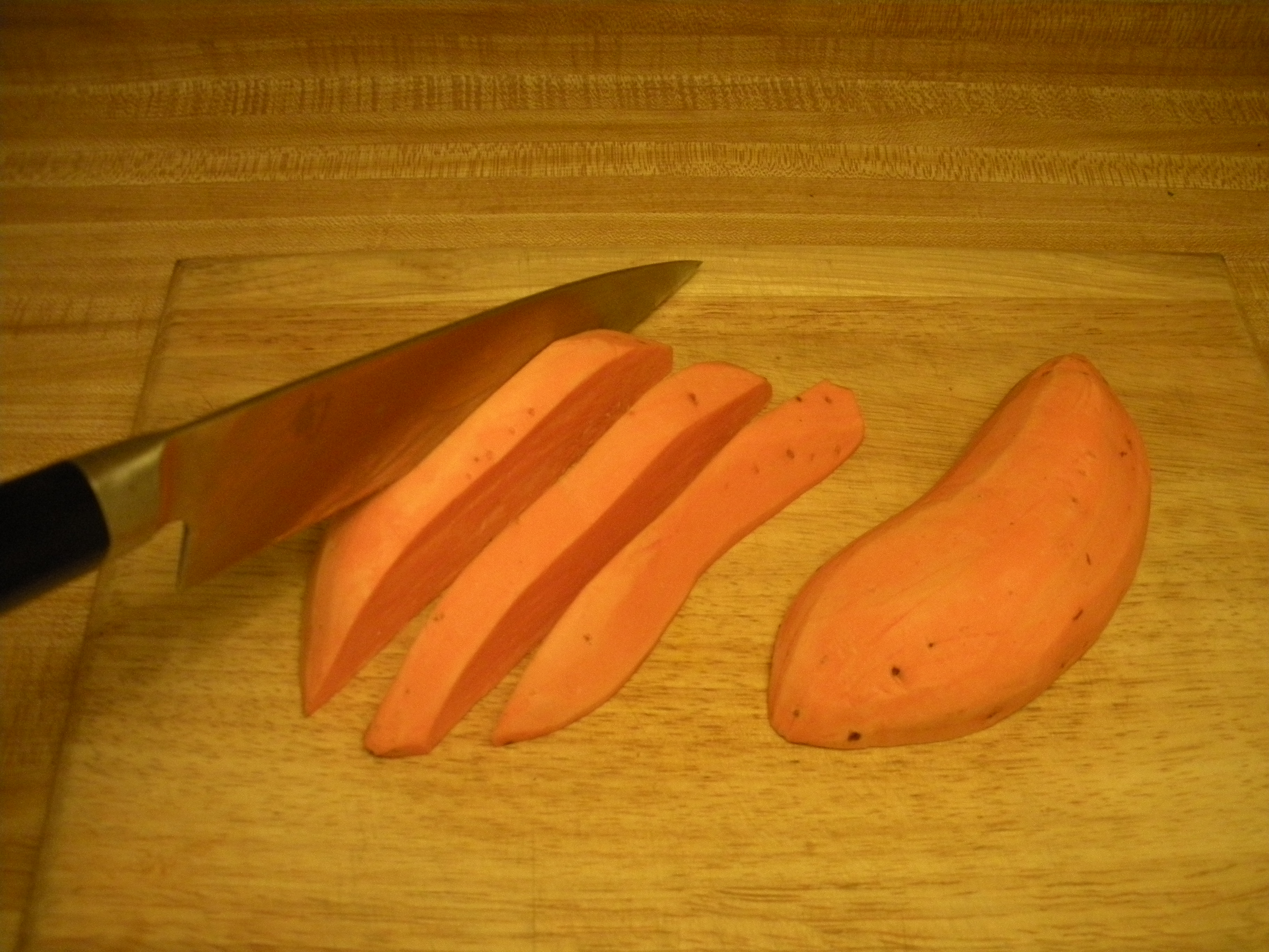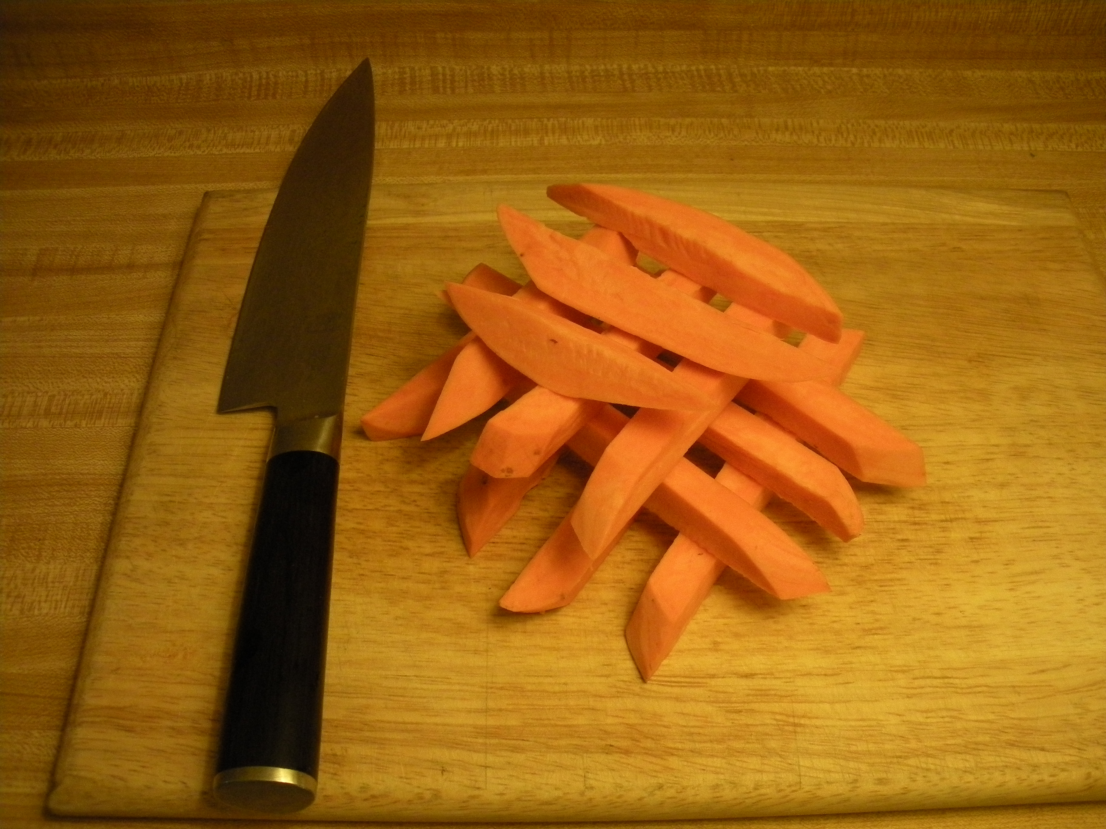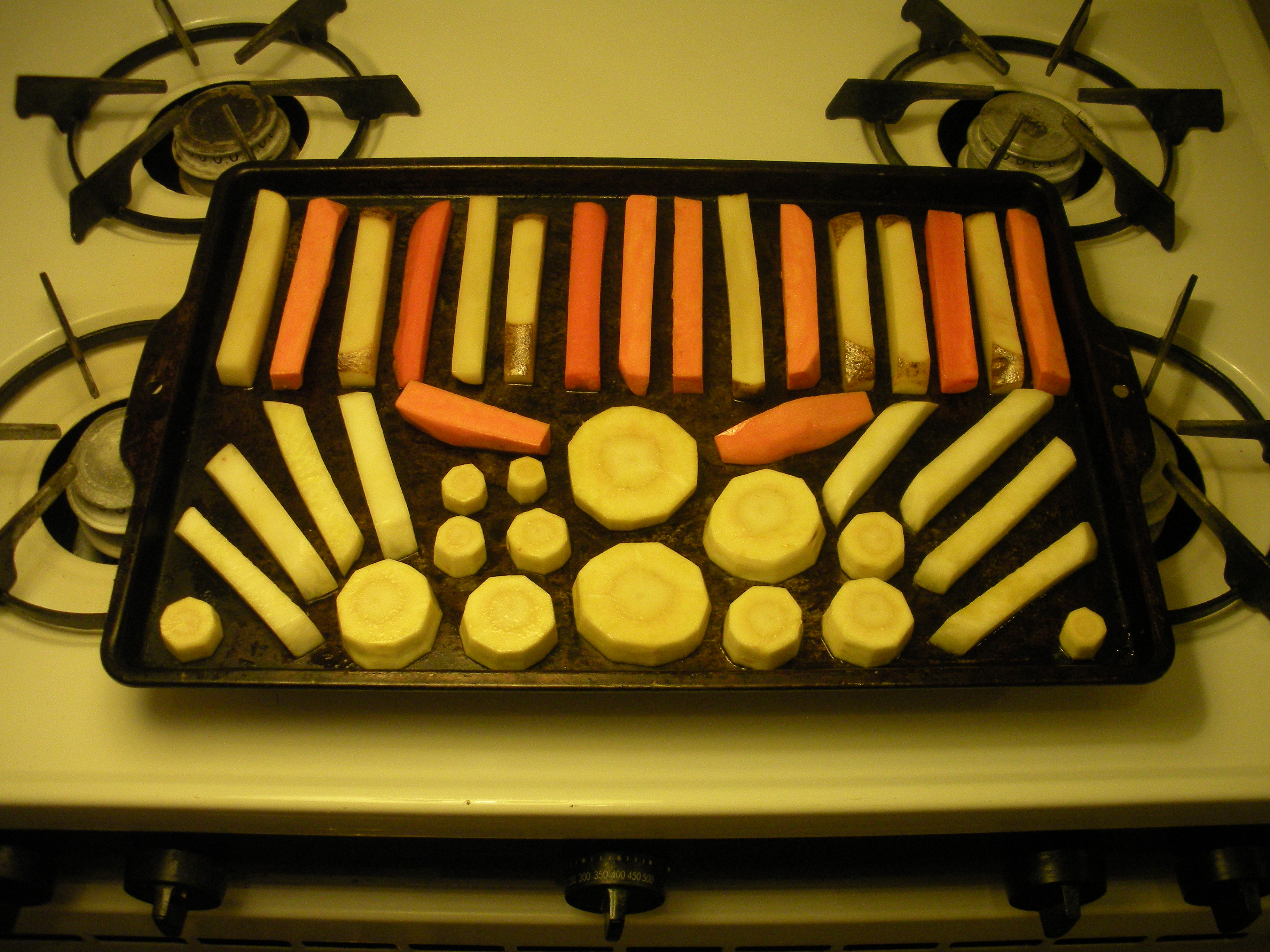 Cutting the roots into thin “shoe strings” reduces cooking time, and yields crisper “fries.” Cutting them into thicker pieces increases cooking time, and yields softer “fries.” Cutting all the different roots in a similar shape/size aids in them having similar baking times.