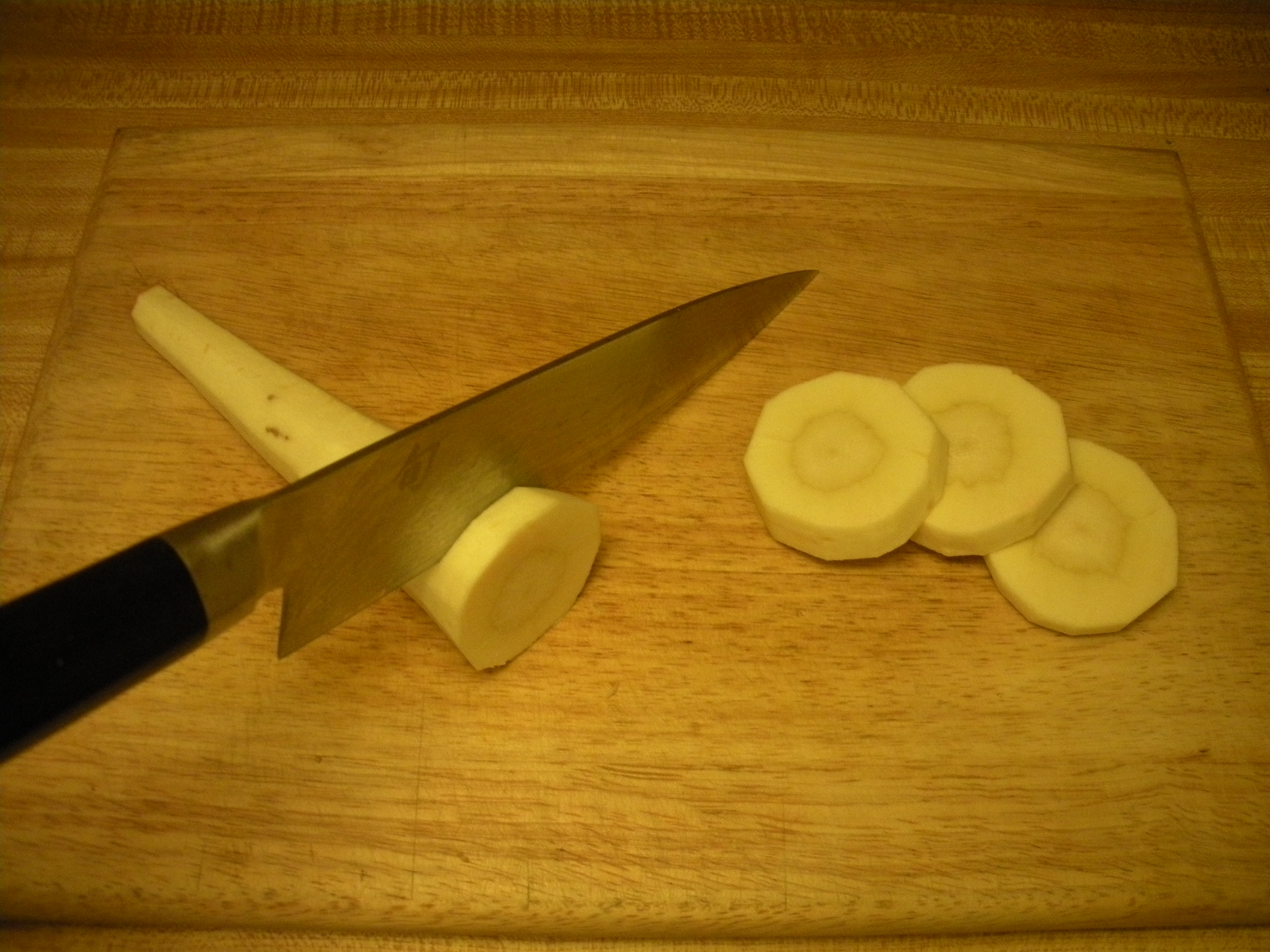 Parsnips can be quite fibrous – I usually cut across the fibers to create rounds.