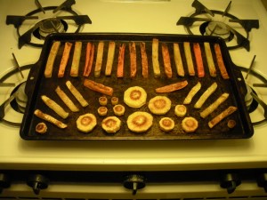 I did not include beets, as they dye the other roots purple, which can be off-putting to some children. If one’s children like beets, one might even let them color the other roots with the beets, before tossing them in the aquafaba and salt.