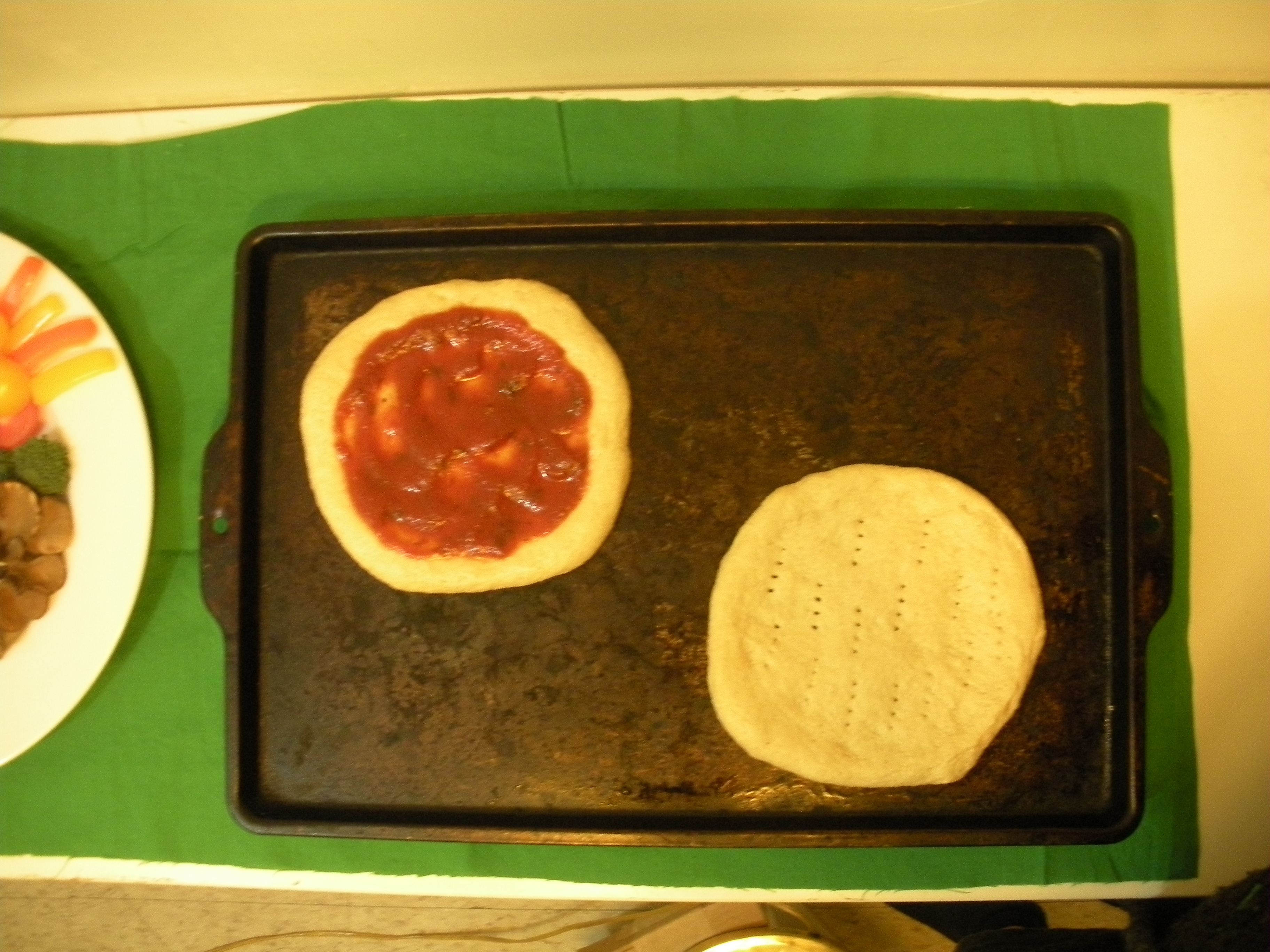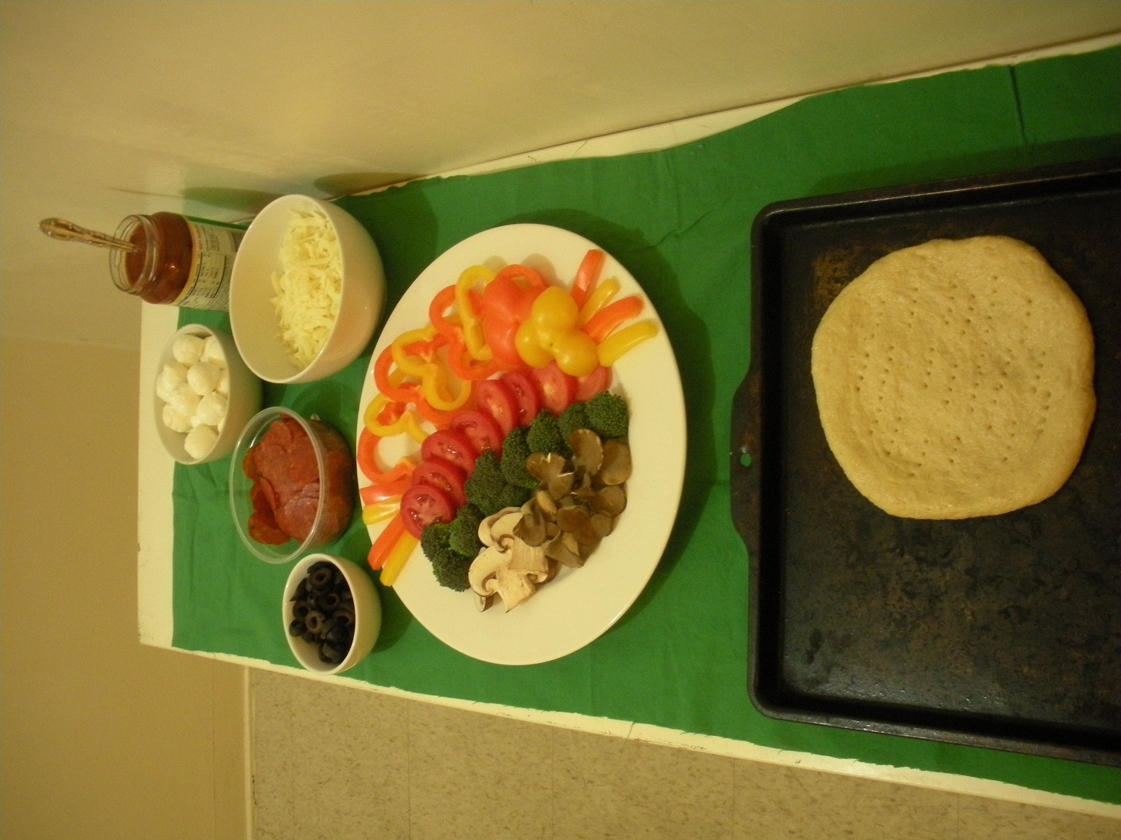 7. While dough is rising, prepare toppings, and arrange for pizza assembly on counter top.