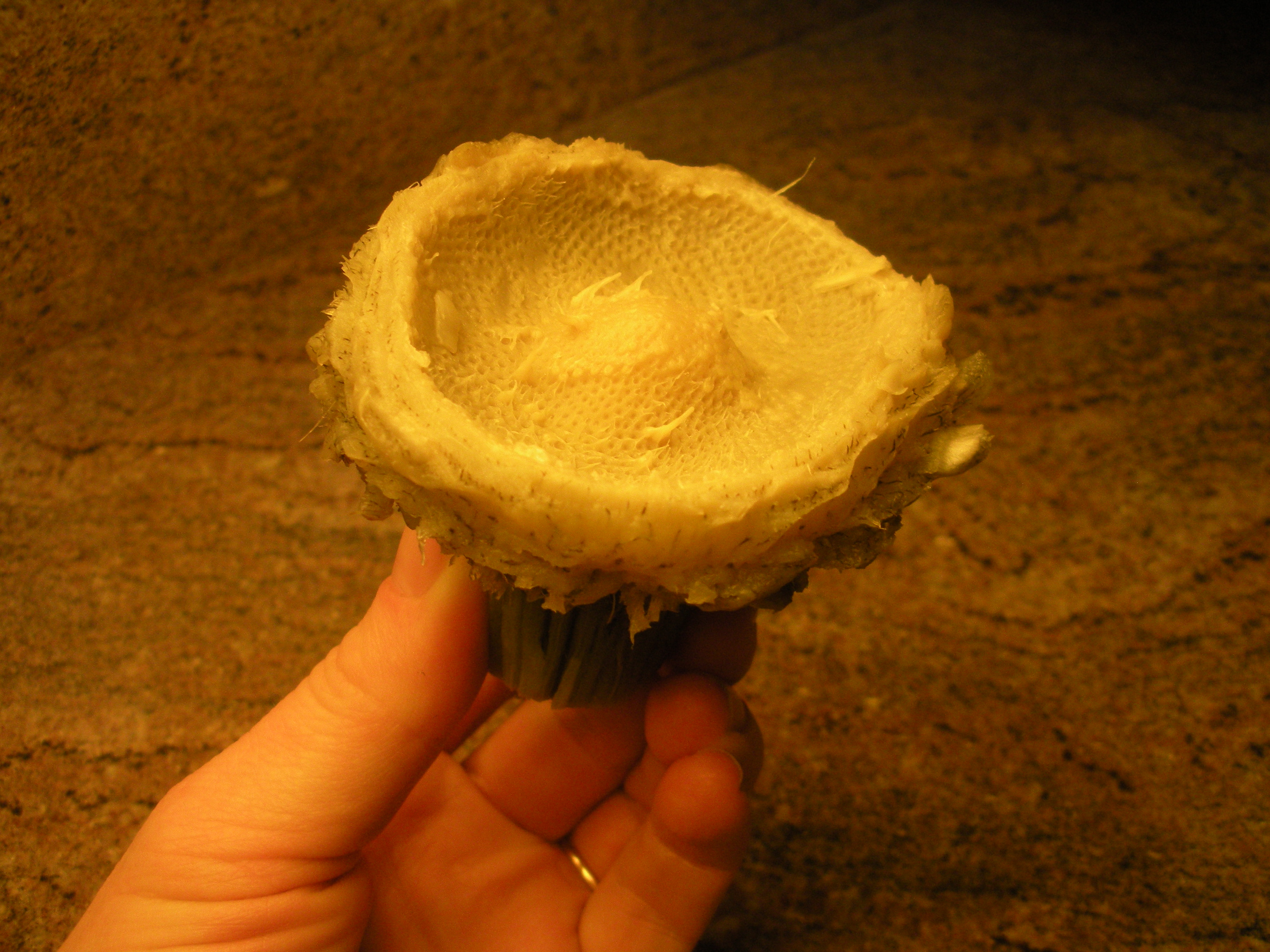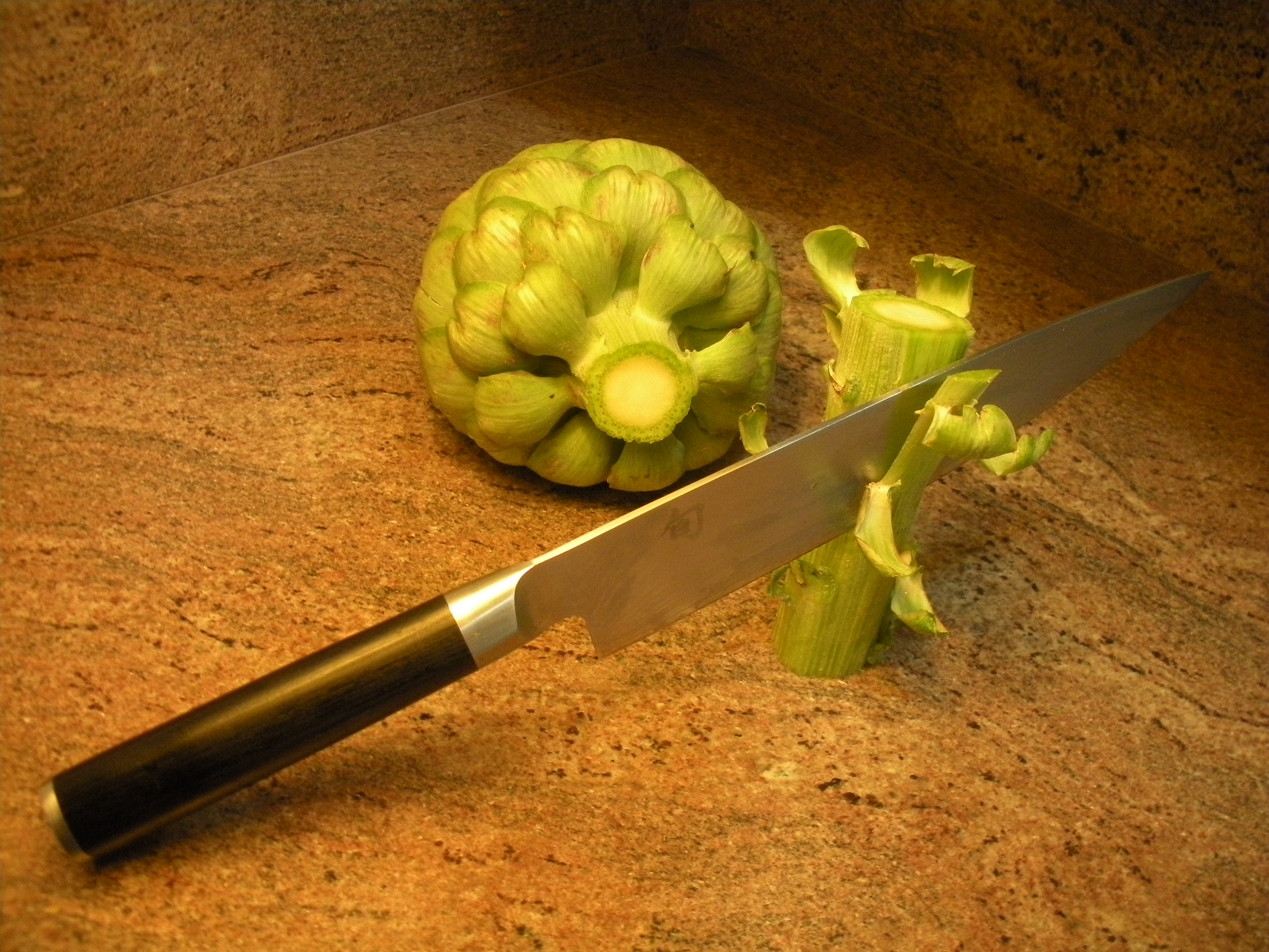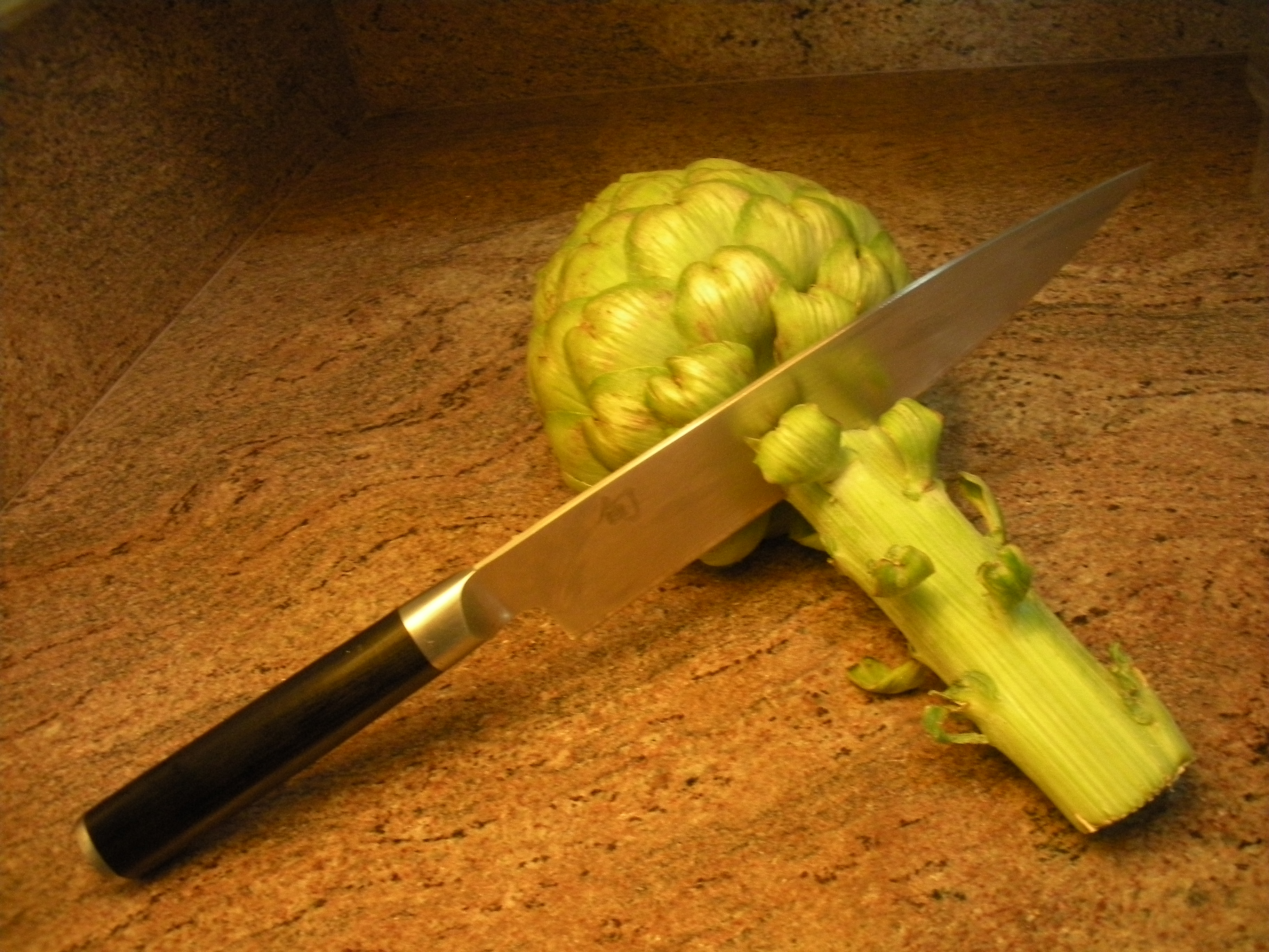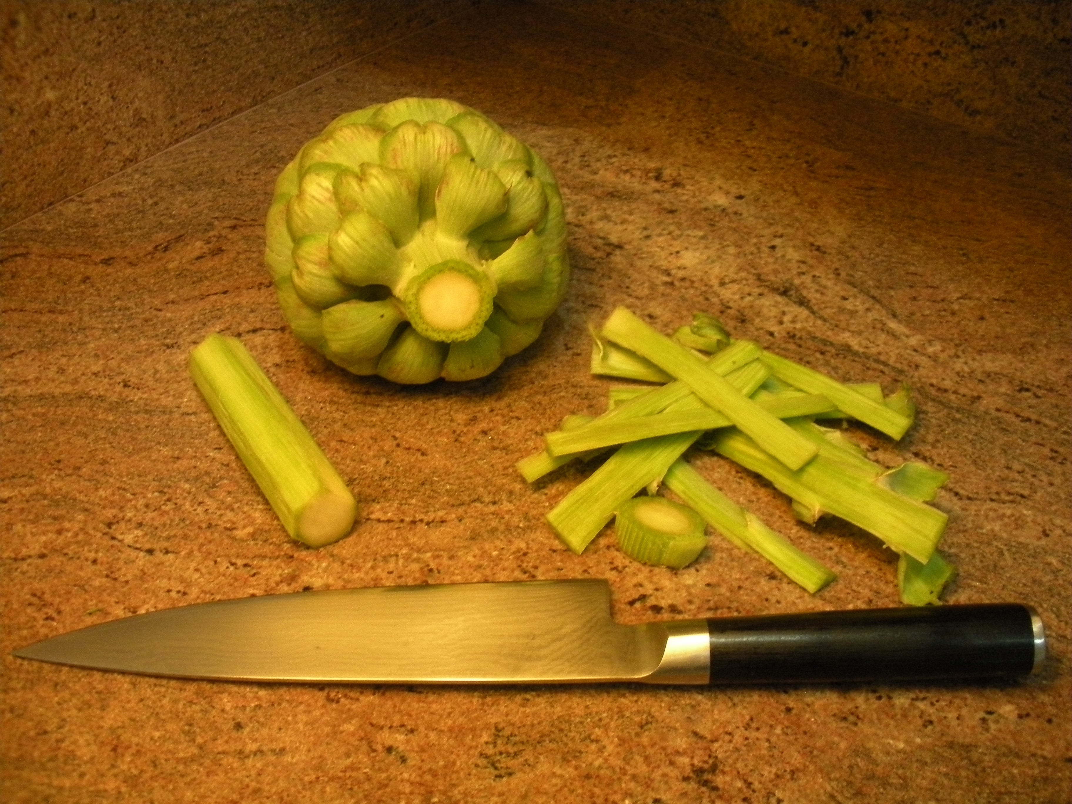 1.  Cut off artichoke stem.  Cut off fibrous outer layer of stem.