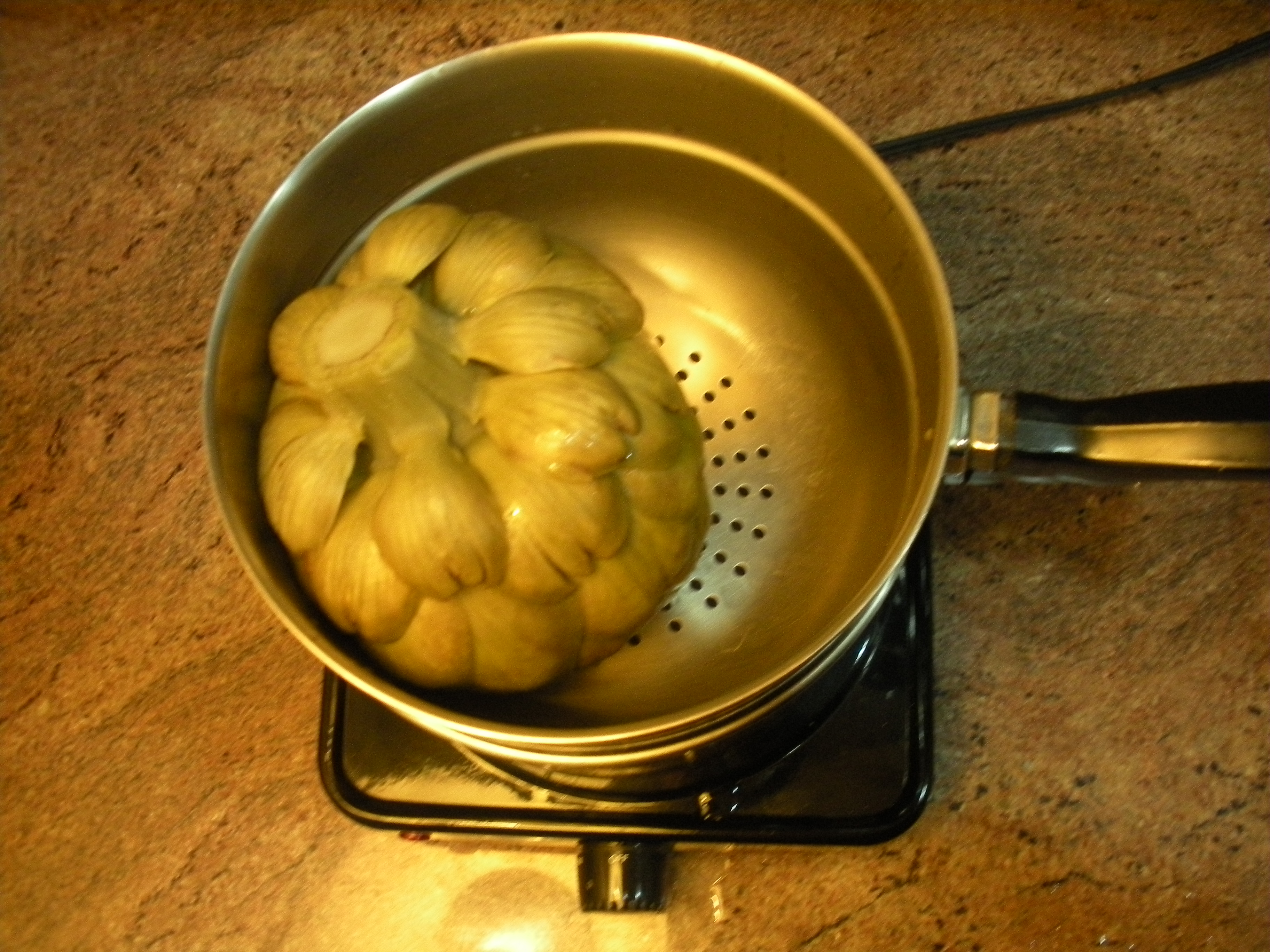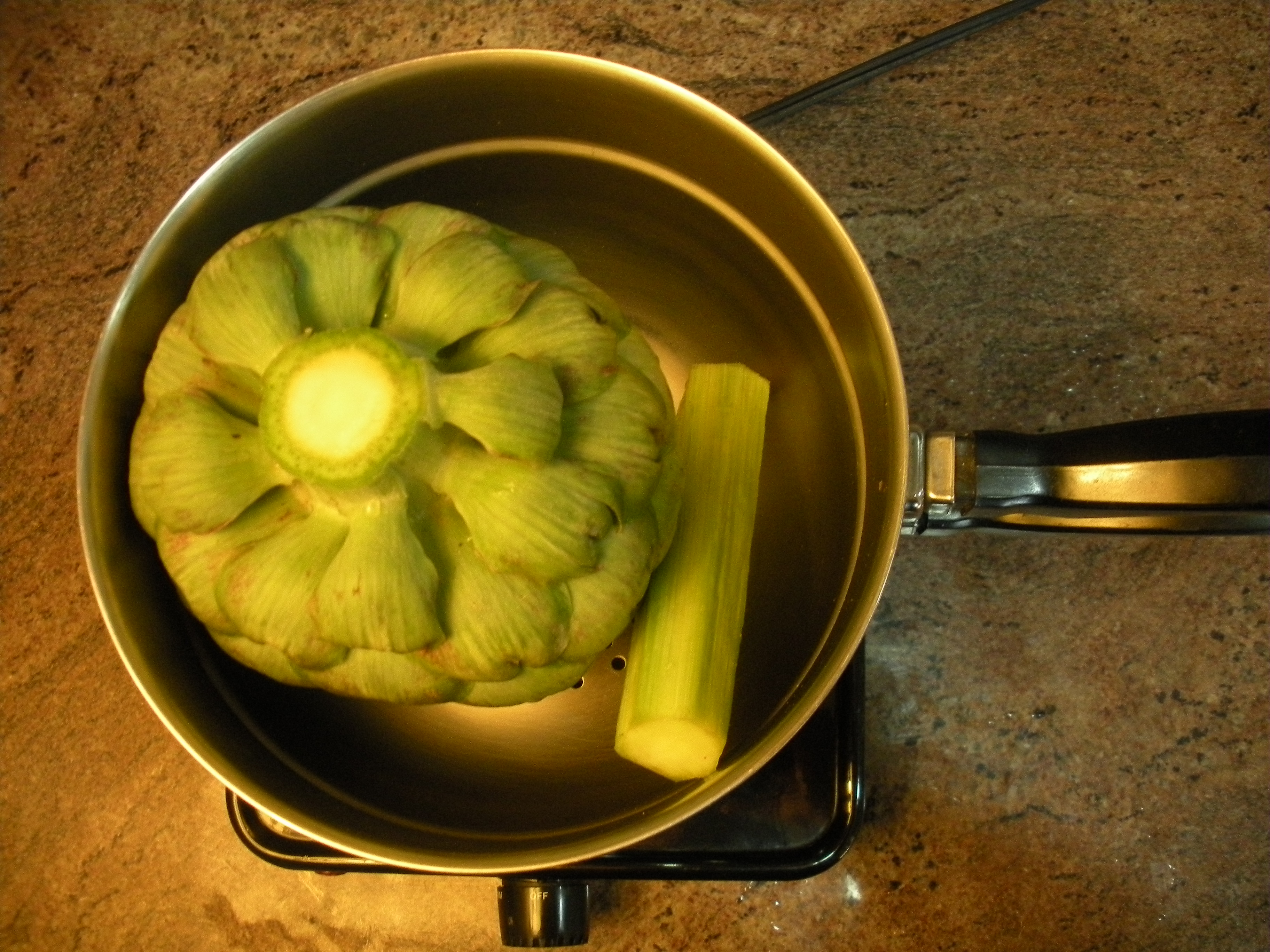 2.  Gently open artichoke leaves a bit if tightly closed.  Place artichoke and stem in steamer pot, bring to a boil, and steam for ~1 hour, until the cooled edible flesh of a leaf is tender.