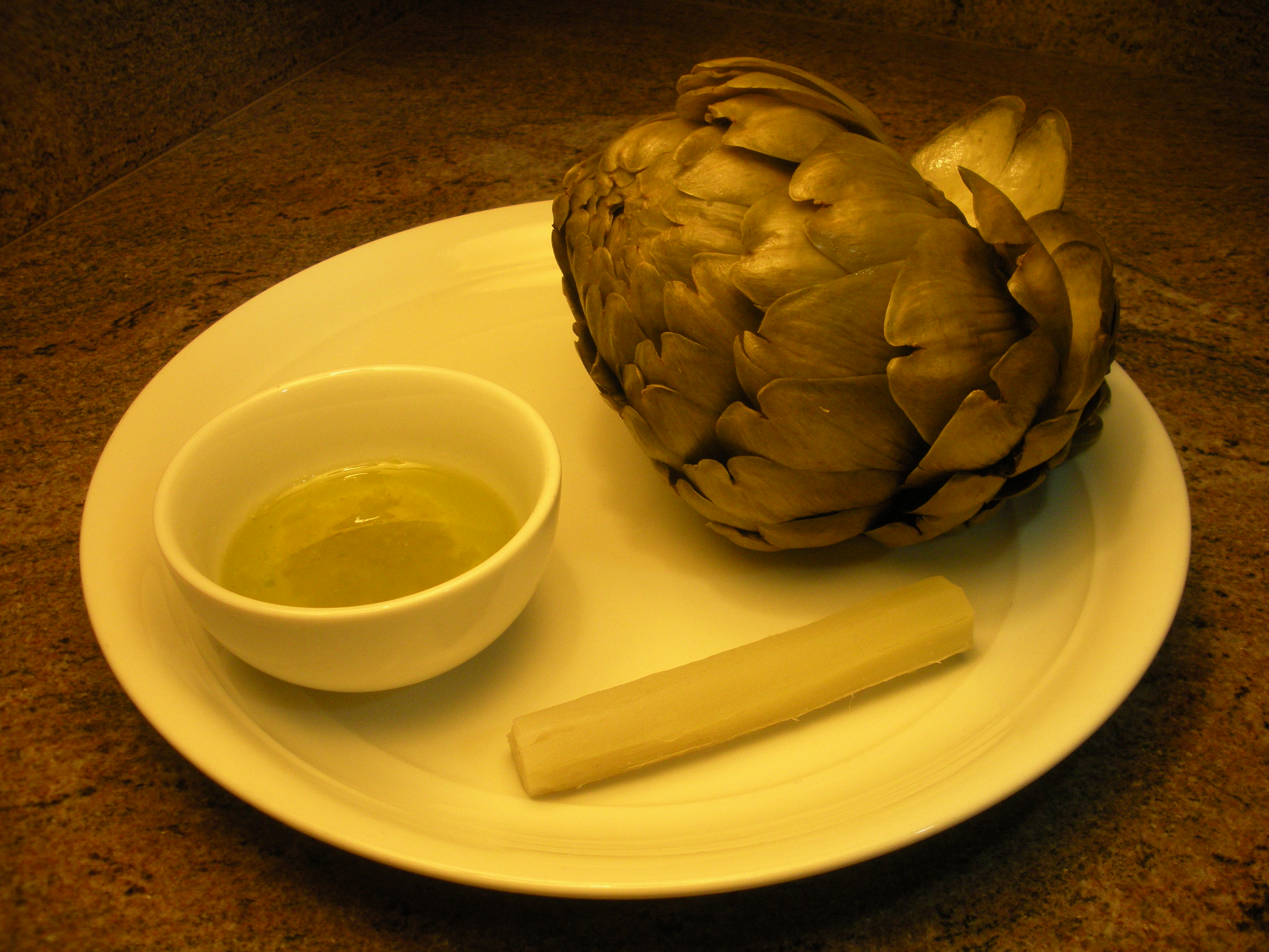 4.  Place artichoke, stem, and garlic oil on a serving plate.  Enjoy!