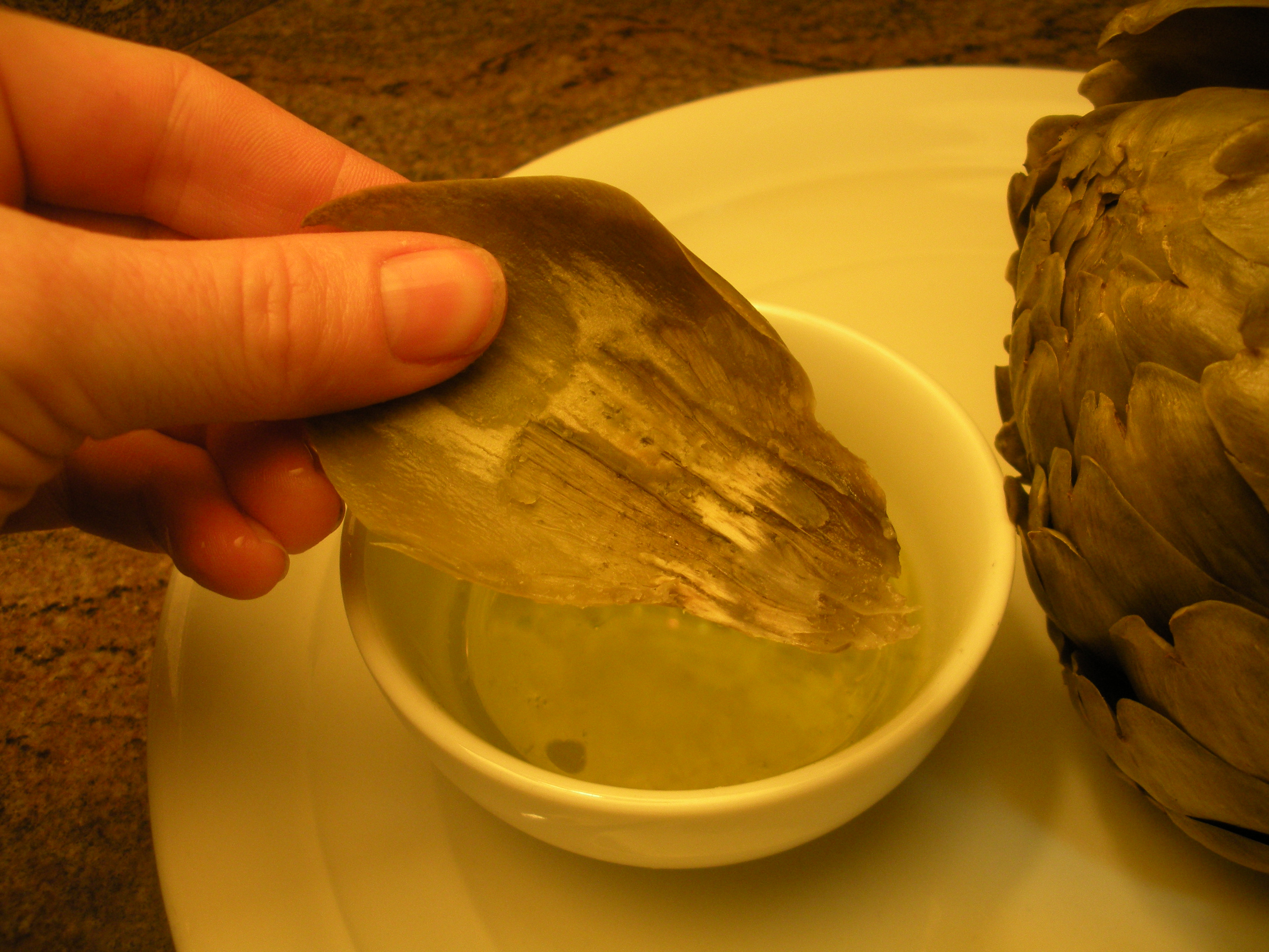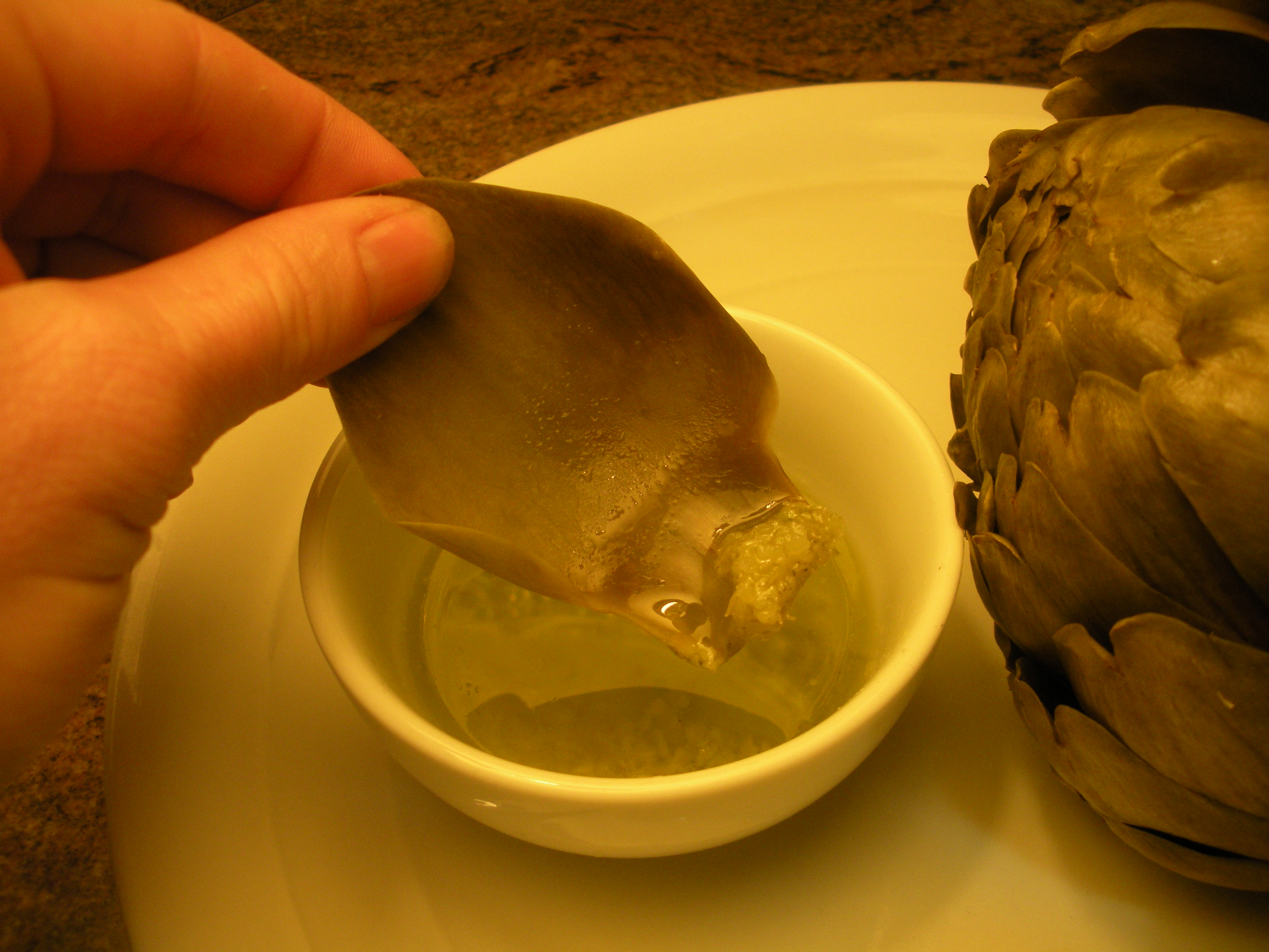 Leaves are often removed one at a time, and dipped in garlic olive oil, dressing, or other sauces. Placing the leaf in one’s mouth, close one’s teeth, and draw out the leaf, scraping off the tender flesh on the inner side of the leaf into one’s mouth.  At the center of the leaves, is the “bearded” artichoke heart.  Scrape off the hairy beard with a spoon, and share the entirely edible heart with your loved ones.  The stem, once its outer fibrous layer is removed with a knife and it is steamed, is also edible.