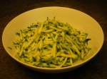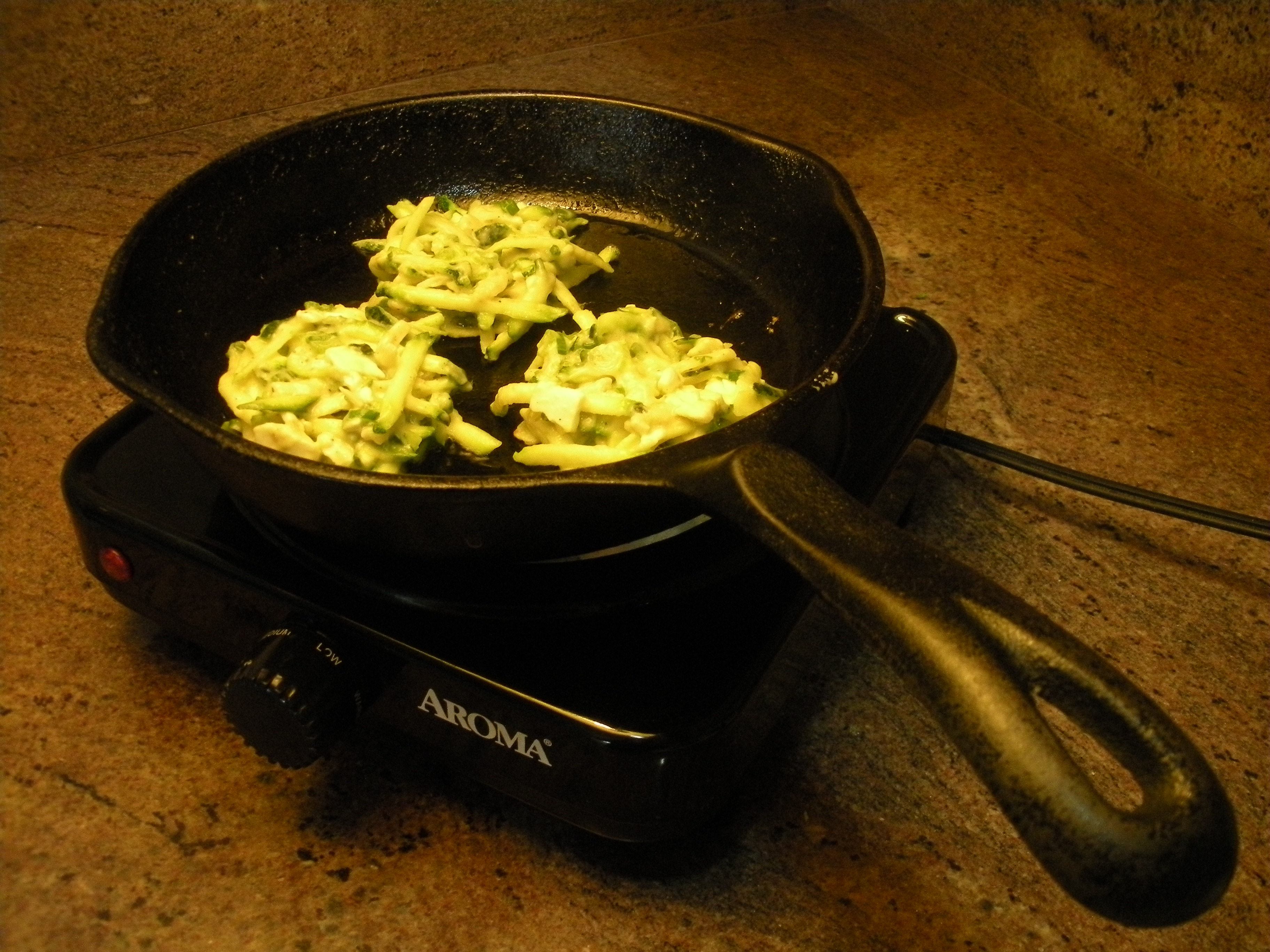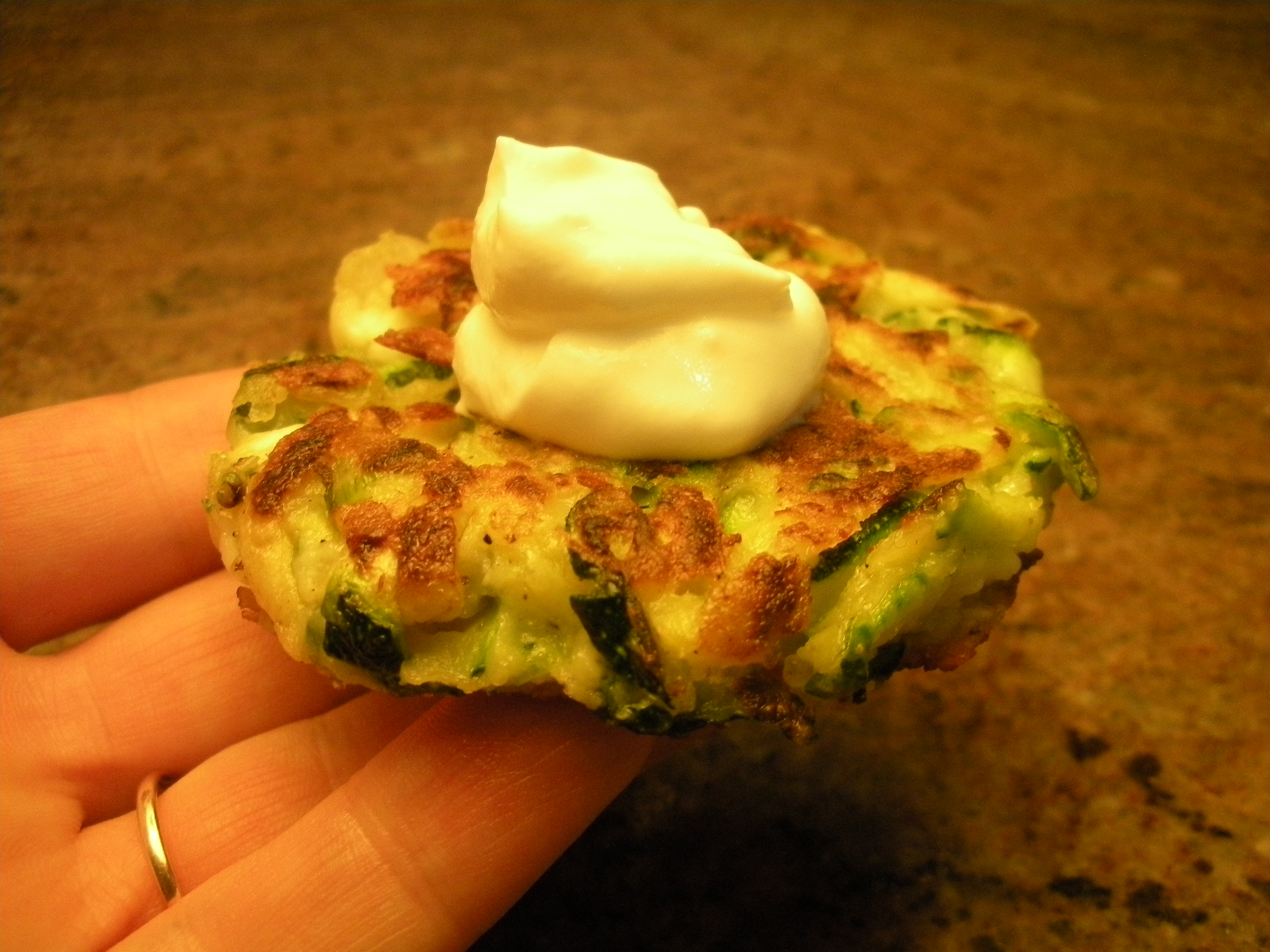 Recipe Variations: To maximize fritter crispiness, one can place grated zucchini in a wire strainer placed over a bowl, stir in salt, and let stand 10-20 minutes until liquid has drained out of zucchini. Wrap zucchini in paper towels/cheese cloth and press/wring out remaining moisture. Make fritters following recipe below (it may need a little more salt), and then crisp on a baking sheet in a 200F oven for 10+ minutes before serving.