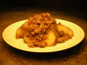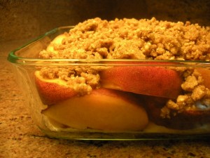 This week’s recipe is for Peach Crumble. Fruit can be a healthful and delicious dessert for our families. Our crumble recipe lets peaches take center stage. Made with whole grains, and low in sweetener, it’s a dessert that tastes sinful, but that one can feel good about. Using naturally sweet, fully-ripened, soft peaches eliminates the need to sugar or pre-cook the peaches. If one’s peaches aren’t fully ripe, and one can’t wait a moment longer to eat them, they can be poached in some peach/white grape juice or sautéed until soft, and then used in recipe below.