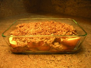 2. Arrange peaches in baking dish. Cover with crumble topping.