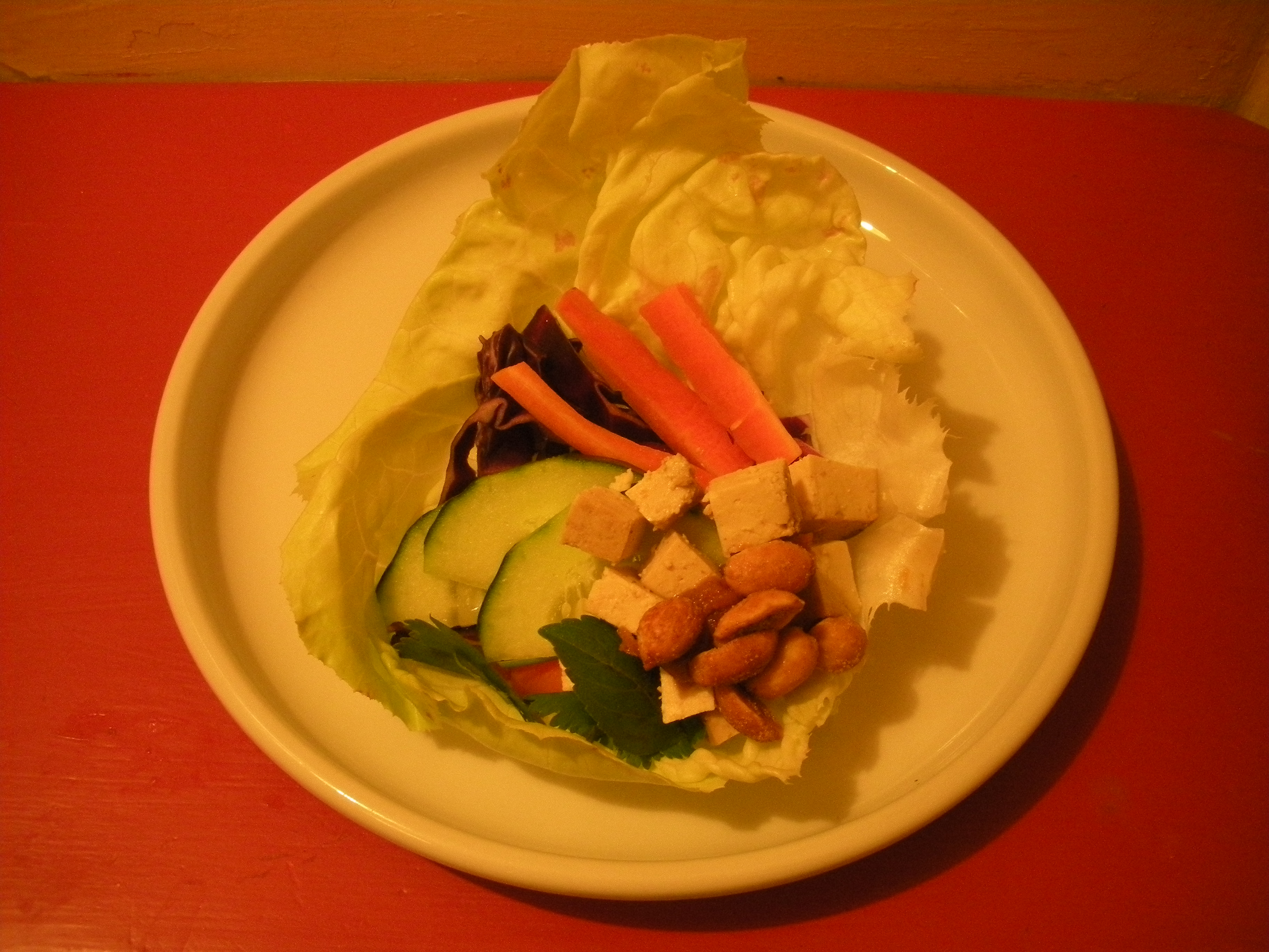 2. Fill lettuce leaves with one’s choice of veggies, legumes, nuts and sauce.