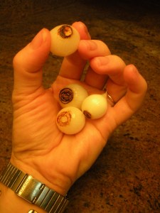 4. Turn on the burner to medium, and saute onions until cut side browned, forming an “iris” on the “eyeballs.”