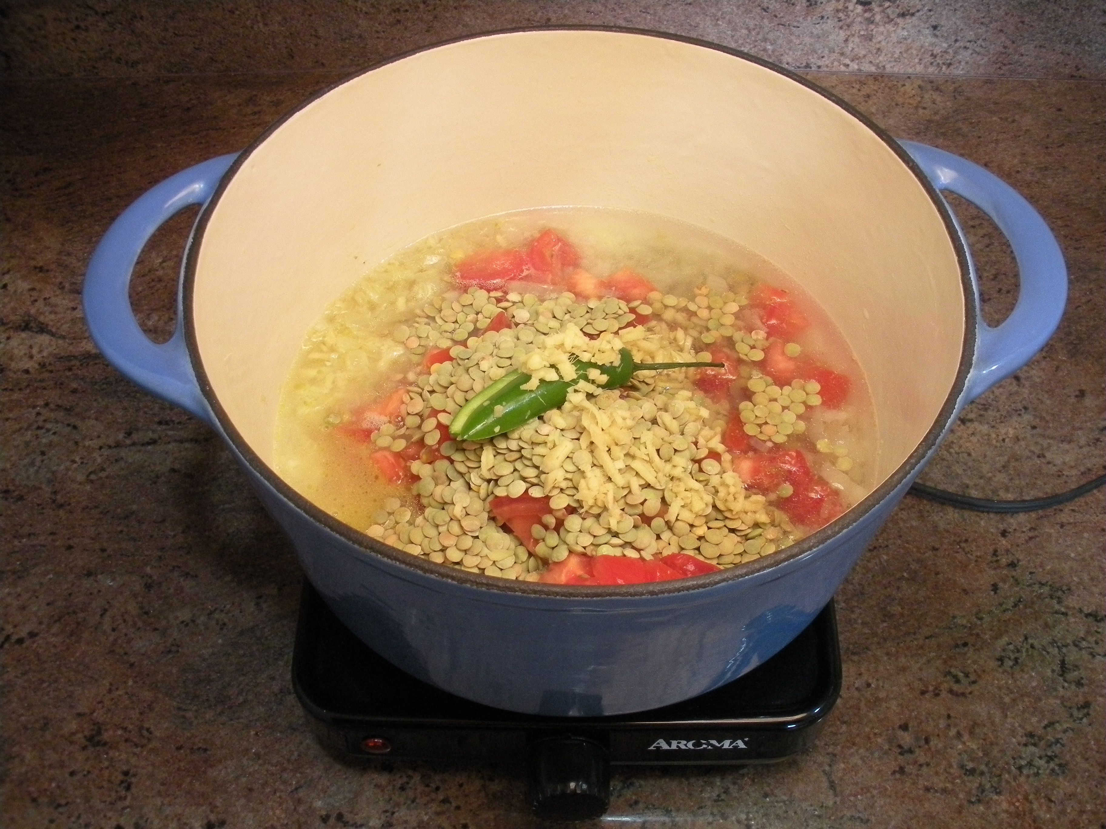 Add water, lentils, tomatoes, ginger and optional chile and bring to a boil.