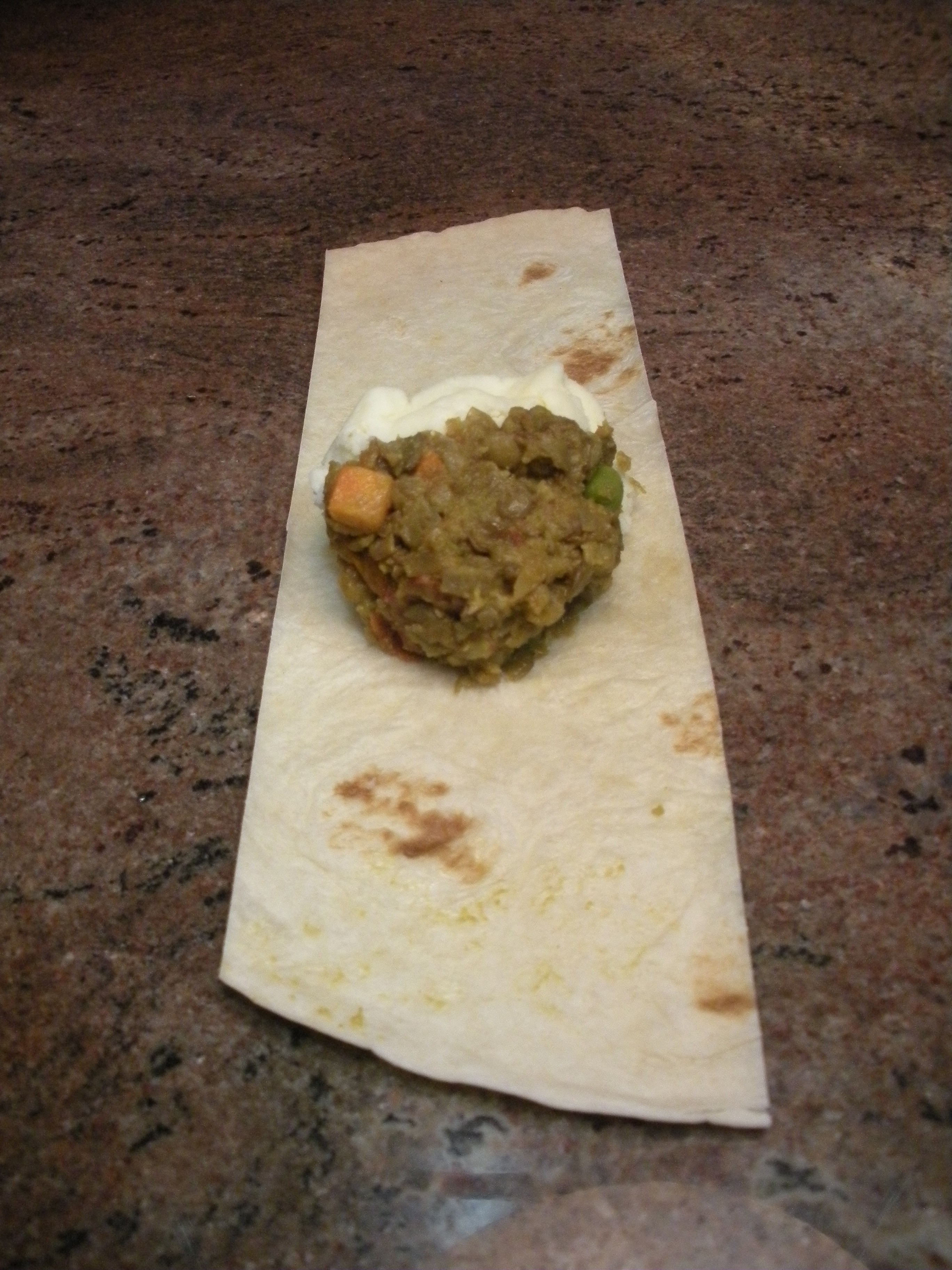 Place a generous tablespoon of lentil daal, and of mashed potatoes onto the center of the tortilla strip.