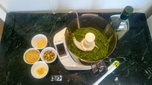 1 medium zucchini, roasted until soft, and a small handful of buttery green olives